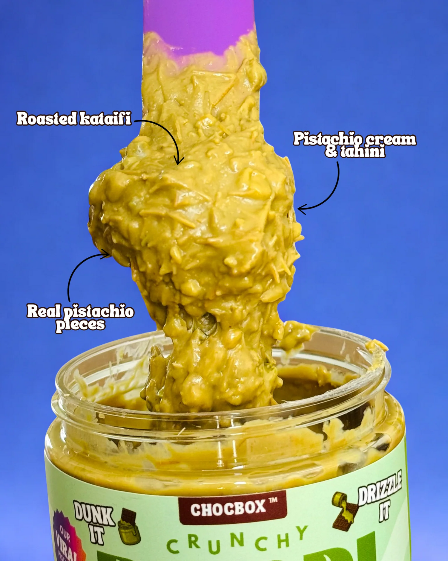 - A creamy pistachio and tahini blend with a satisfying crispy crunch in every bite.